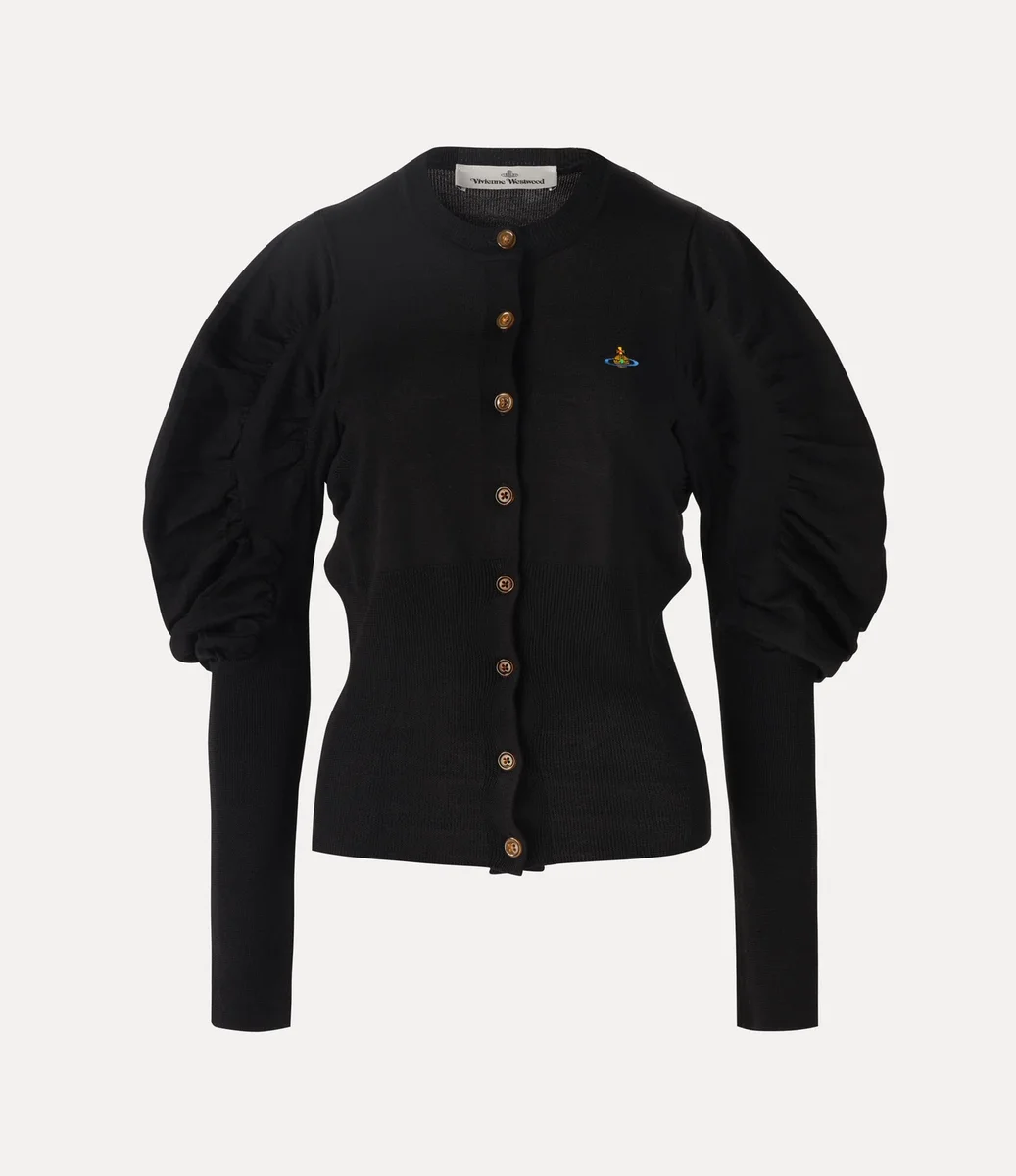 Kardigan Eli powraca w tym sezonie w miękkiej wełnianej wersji, o dopasowanym kroju, z obszernymi rękawami i wydłużonymi ściągaczami przy mankietach i u dołu. Całość dopełnia wielobarwna haftowana kula na piersi, symbolizująca połączenie przeszłości z przyszłością.