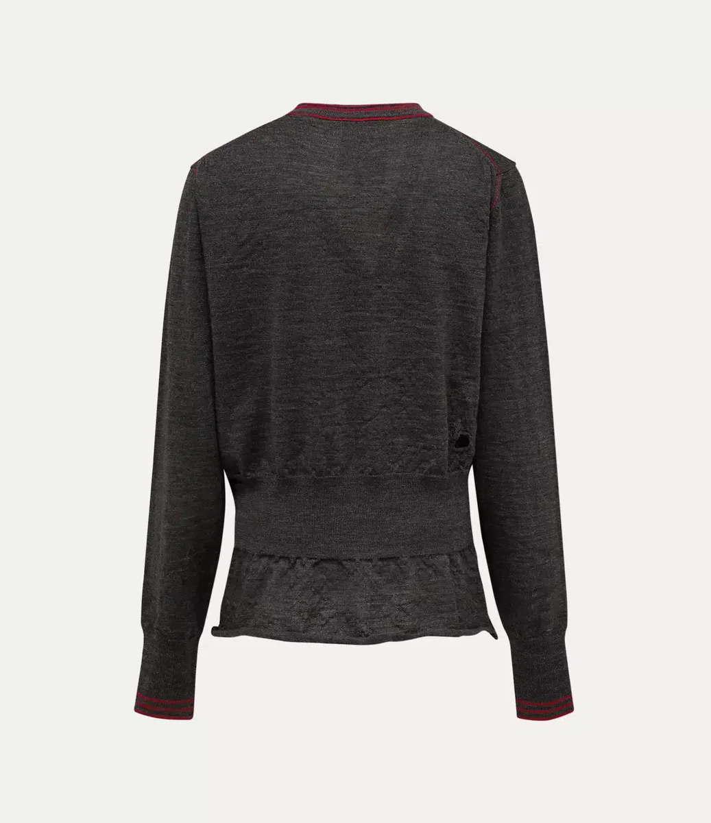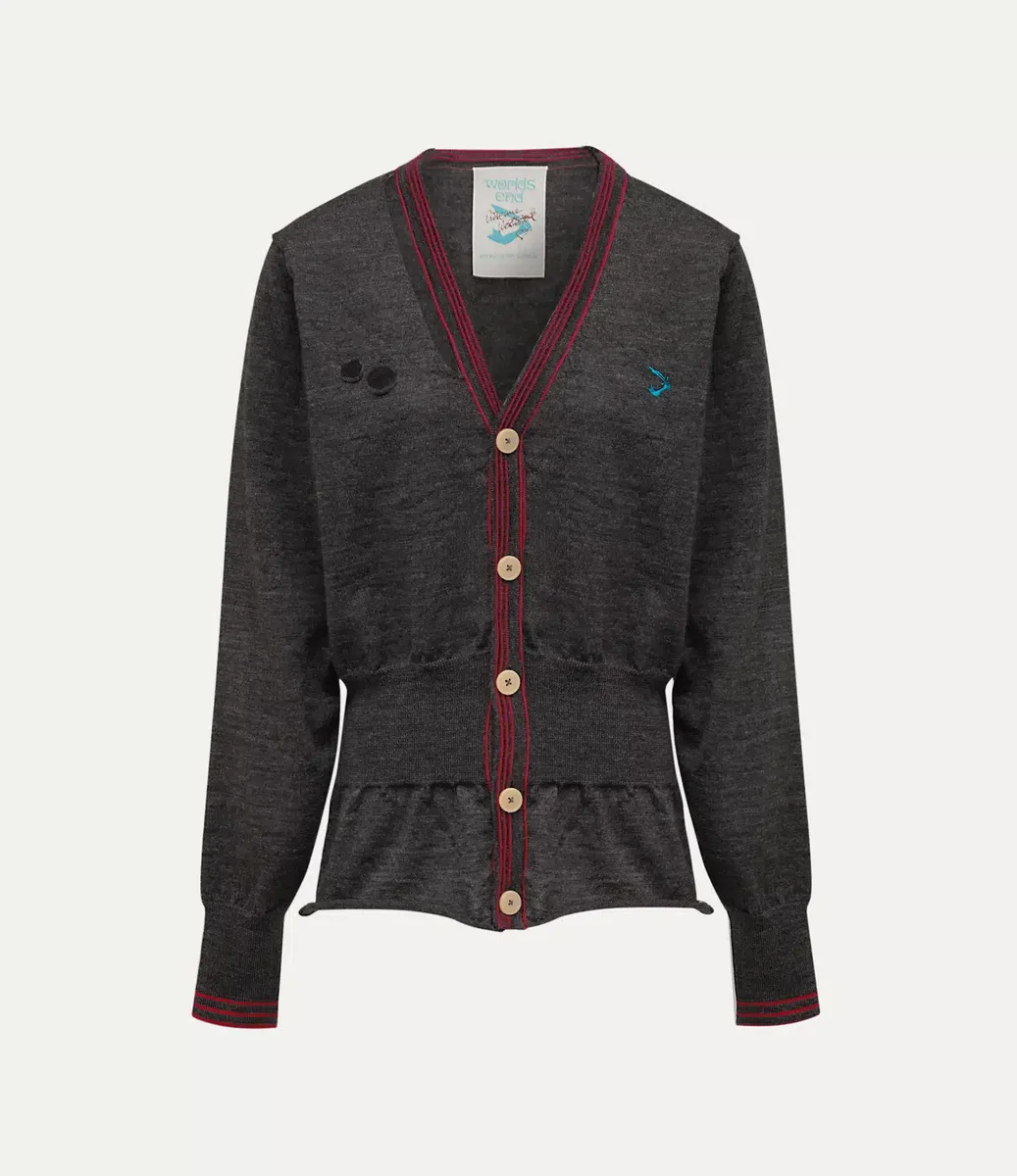 Nasza kardigana Worlds End Chaos ma zapięcie na guziki z przodu i dekolt w szpic, a dodatkowym akcentem jest detal „Arm and Cutlass” na lewej piersi. Ubranie ma podwinięty dół i dwa rozcięcia z przodu, nawiązujące do kultowej kolekcji „CHAOS” Vivienne i uosabiające jej buntowniczego ducha oraz zaangażowanie w podważanie konwencji politycznych.