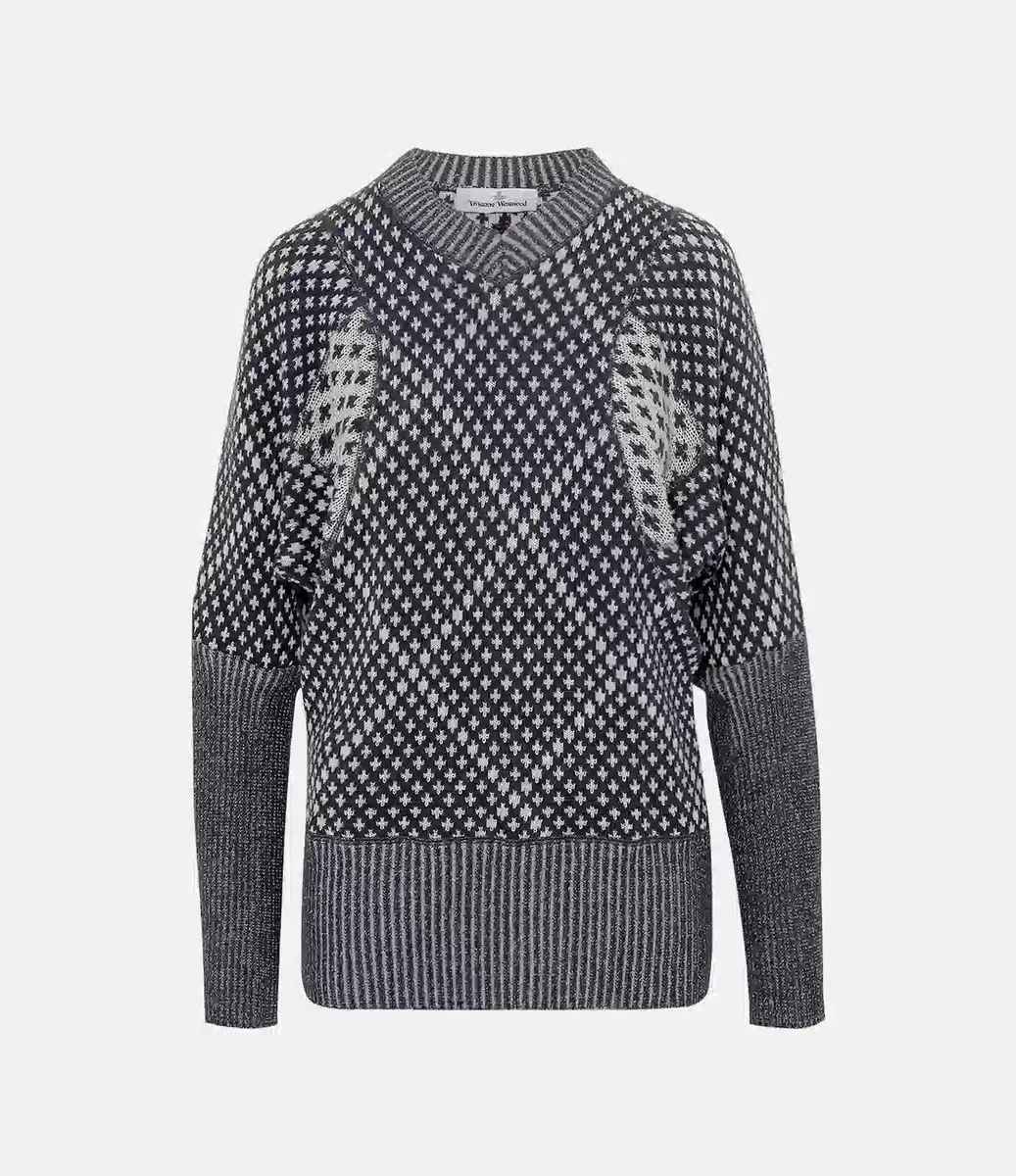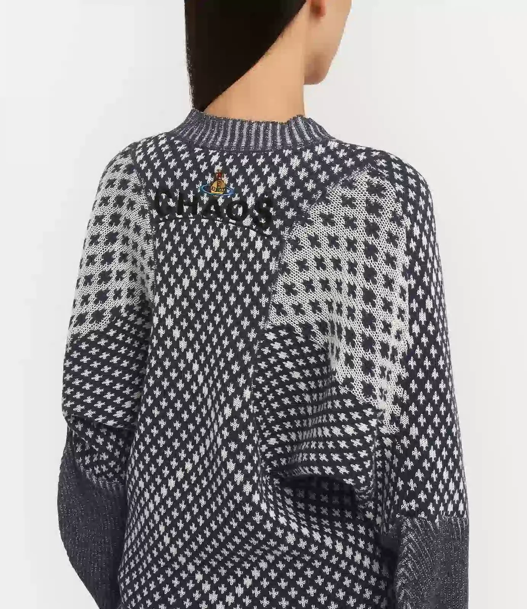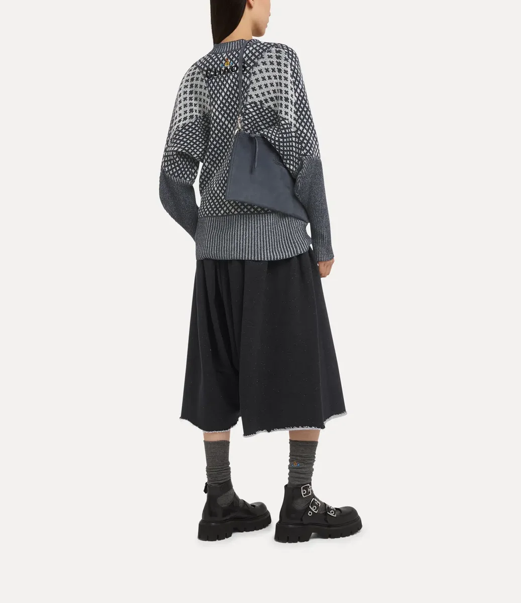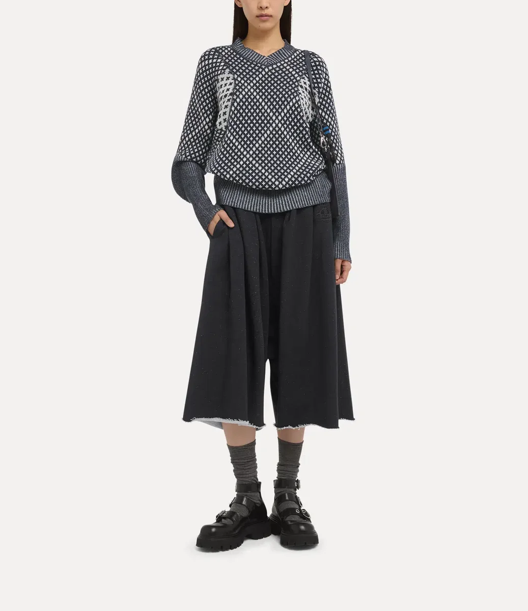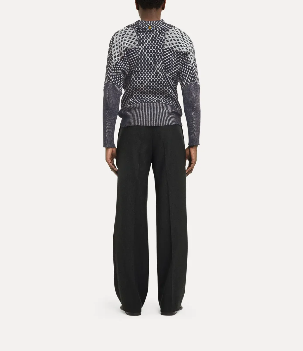 Sweter Pourpoint, wykonany z miękkiej mieszanki bawełny i wełny, ma archiwalny wzór żakardowy „Crosses Argyle” pokryty motywem „Distressed Tartan”. Ma prążkowany dekolt w szpic i długie rękawy z wstawkami, a wykończony jest prążkowanymi ściągaczami i haftowanym emblematem „Chaos Orb” z tyłu.