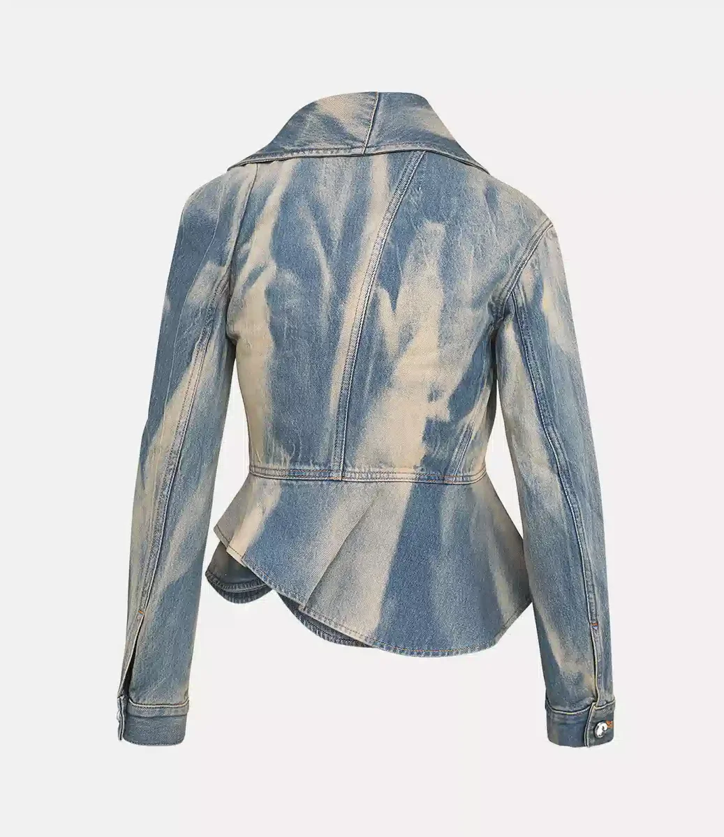 Nasza kurtka dżinsowa Stormy, wykonana z miękkiej bawełny, charakteryzuje się wybielonym, wyblakłym wykończeniem, które nadaje jej postarzany, vintage’owy wygląd. Projekt wyróżnia się przesadnie asymetryczną klapą, która nadaje dekoltowi rzeźbiony charakter, a ostro wyprofilowana talia i rozkloszowany dół tworzą wyraźną, dopasowaną sylwetkę.