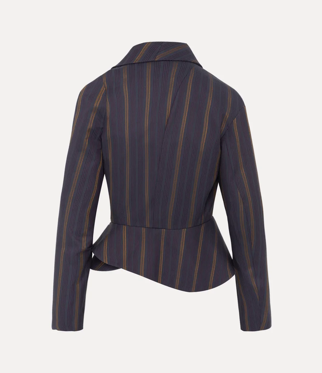 Nasza kurtka Stormy, wykonana z miękkiej mieszanki bawełny, ma granatowy kolor z drobnymi pionowymi paskami w kolorze złotym i bordowym, otoczonymi drapowanym szalowym kołnierzem. Delikatne zaszewki podkreślają talię, przechodząc w rzeźbiony dół z falbaną, a zabawny motyw „plamy kawy” akcentuje wnętrze.