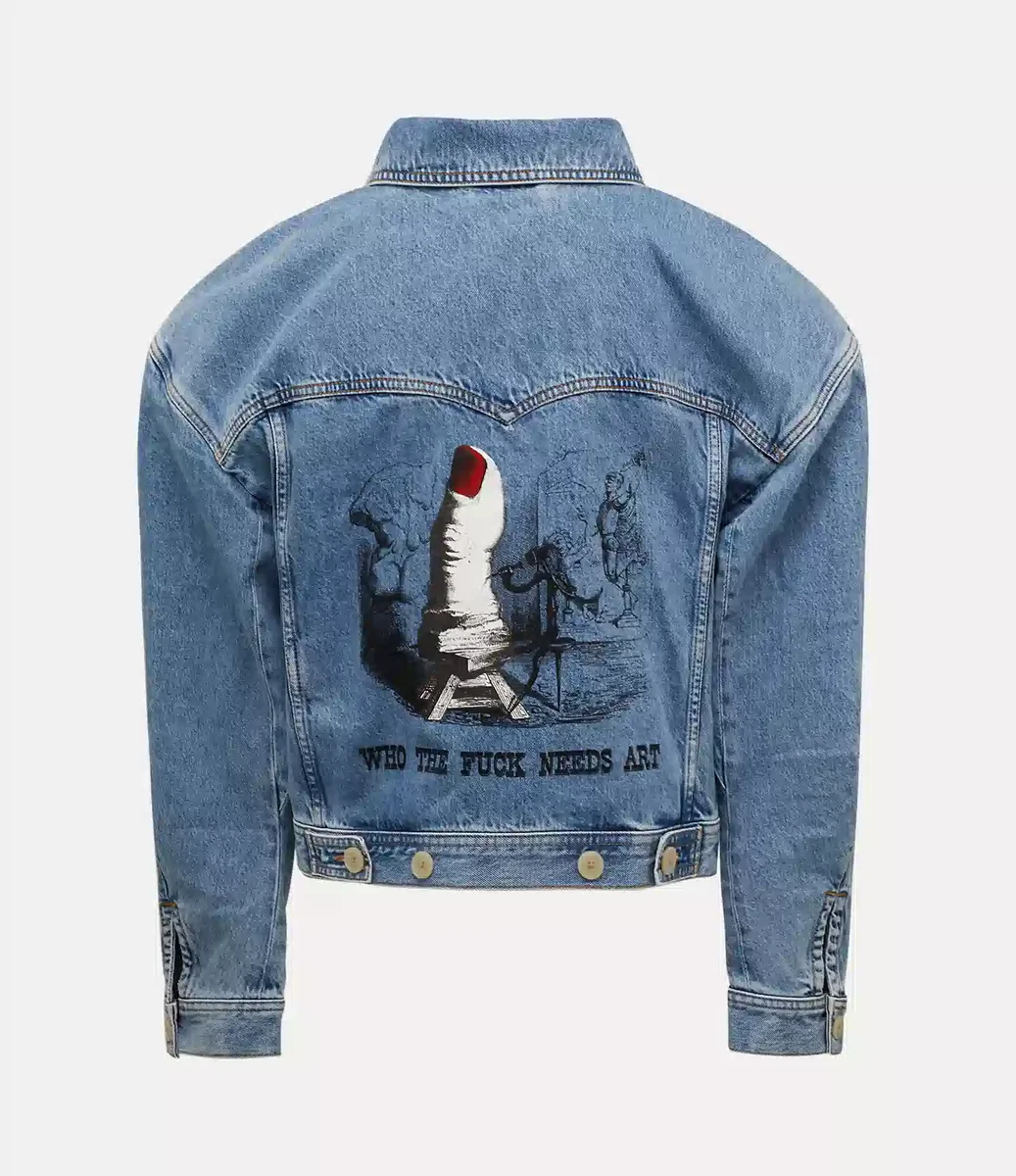 Nasza kurtka Worlds End Denim Boxer ma sportowy krój z dużymi kieszeniami i obniżonymi szwami na ramionach. Z tyłu znajduje się nadruk z archiwalnym sloganem marki „Who the Fuck Needs Art” z kolekcji „Propaganda” Vivienne Westwood na sezon wiosna-lato 2006, odzwierciedlającym jej punkowe korzenie i zaangażowanie w podważanie konwencji politycznych.