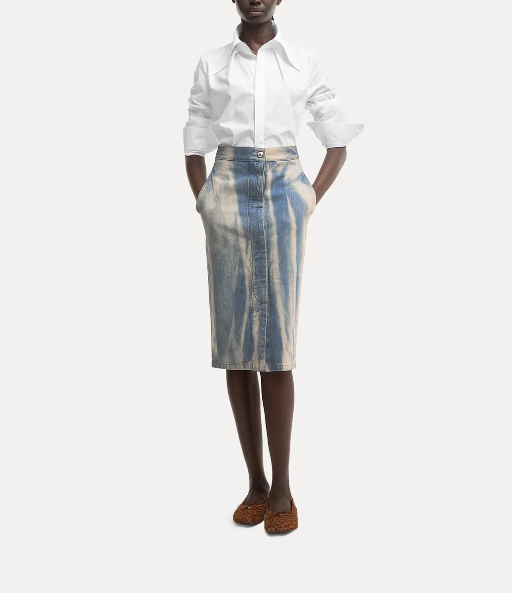 Nasza spódnica-spodnie jest wykonana z bawełny i ozdobiona wyblakłym, wybielonym wzorem, który nadaje jej postarzany, vintage’owy wygląd. Ma wysoki stan, zapinany na perłowy guzik z denimową nitką, i sięga do połowy łydki.
