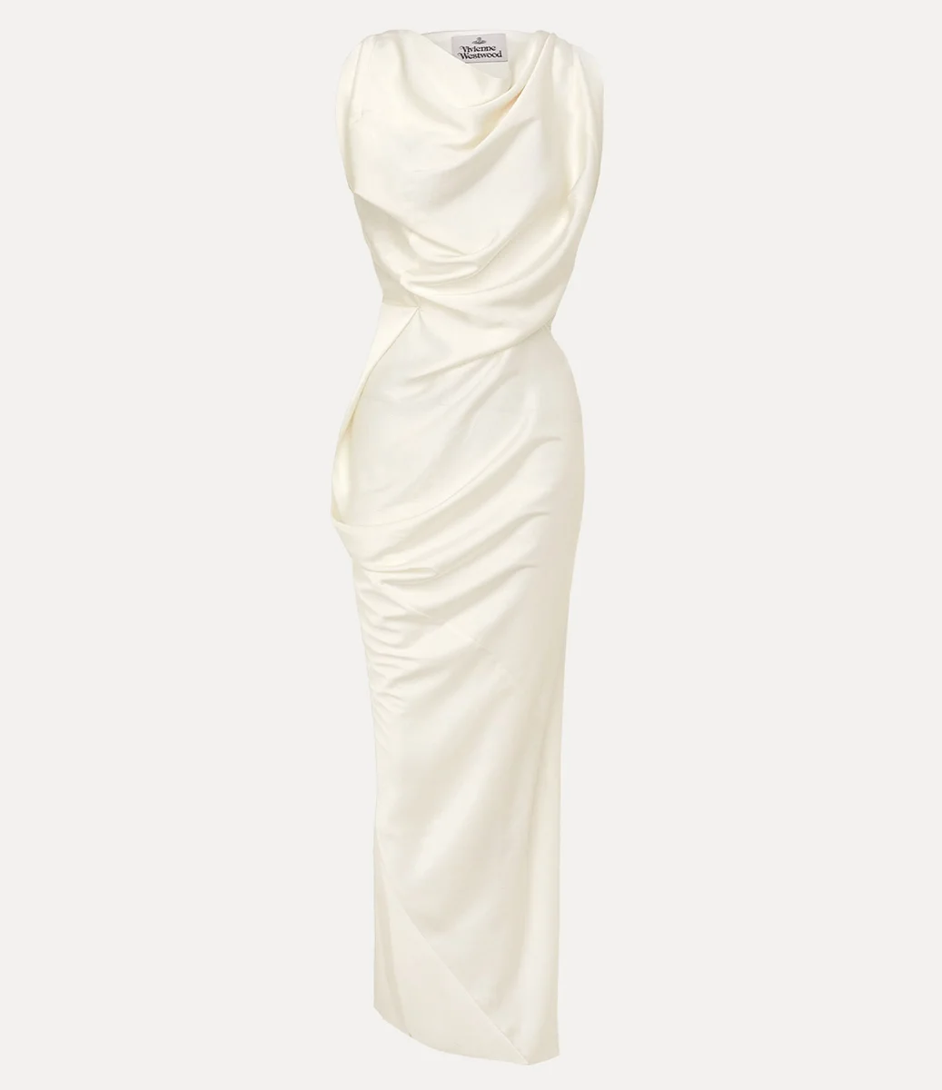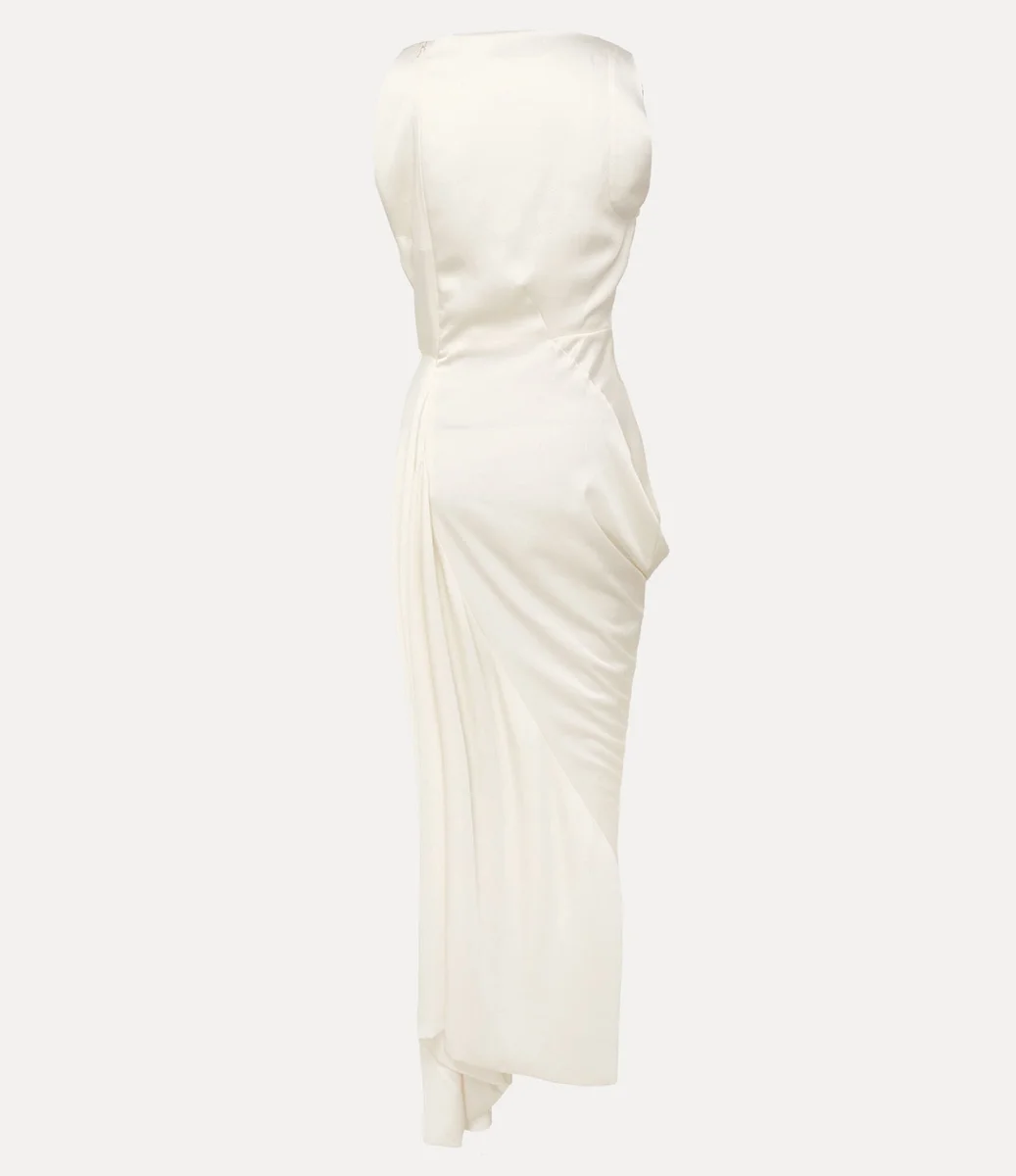 Sukienka Long Fond ma eleganckie drapowanie przy dekolcie i talii, a jej fason ma wydłużoną kolumnę i asymetryczny dół. Dodatkowe drapowanie z tyłu oraz ukryty zamek błyskawiczny z boku zapewniają gładkie wykończenie.