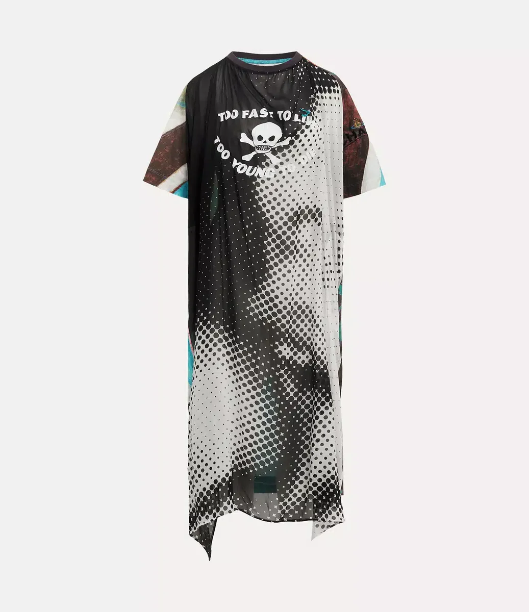 Sukienka Worlds End Swing jest ozdobiona charakterystycznym dla marki motywem Union Jack na rękawach i z tyłu. Całość dopełnia emblemat z czaszką i skrzyżowanymi piszczelami oraz slogan „Too Fast to Live, Too Young to Die” (Zbyt szybki, by żyć, zbyt młody, by umrzeć), zaczerpnięty z szyldu naszego kultowego butiku, znanego obecnie jako Worlds’ End.