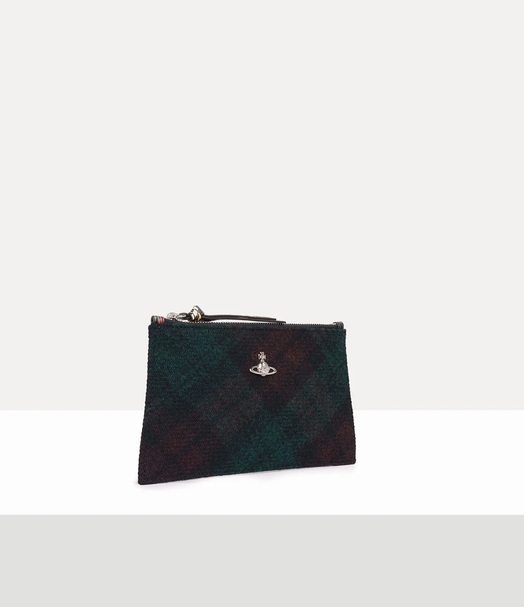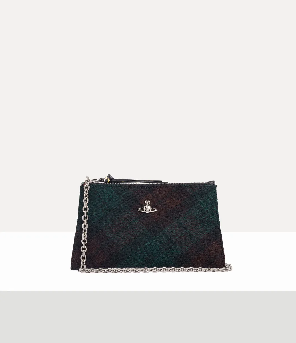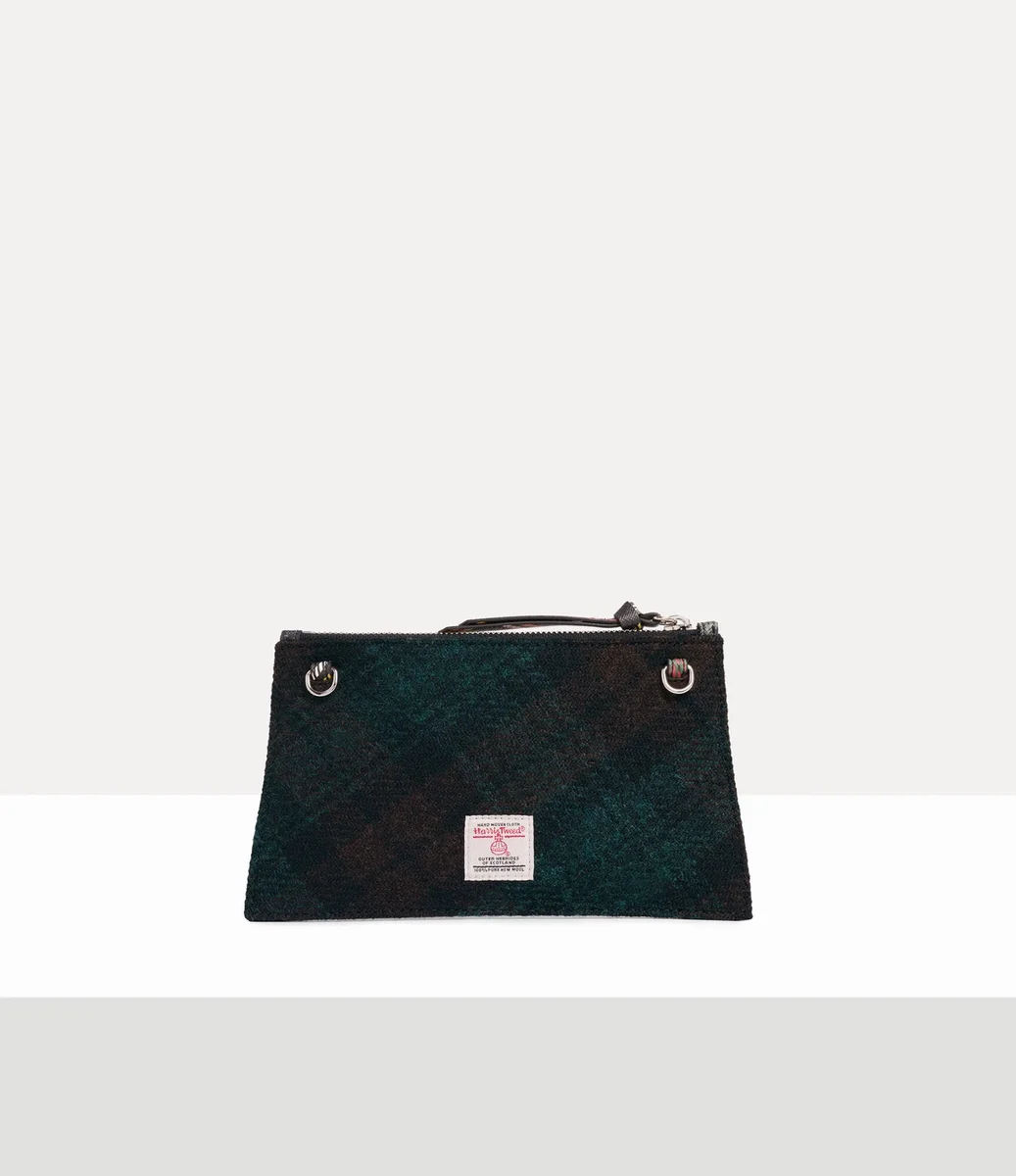 Nasza mała płaska kopertówka z zamkiem błyskawicznym została wykonana z archiwalnego tweedu Harris w ciemnych odcieniach, ręcznie tkanego przez mieszkańców szkockich Hebrydów Zewnętrznych. Model ten, wyposażony w odpinany łańcuszkowy pasek, po otwarciu odsłania naszą charakterystyczną podszewkę w stylu „Union Jack”, a front zdobi ręcznie haftowana kula.