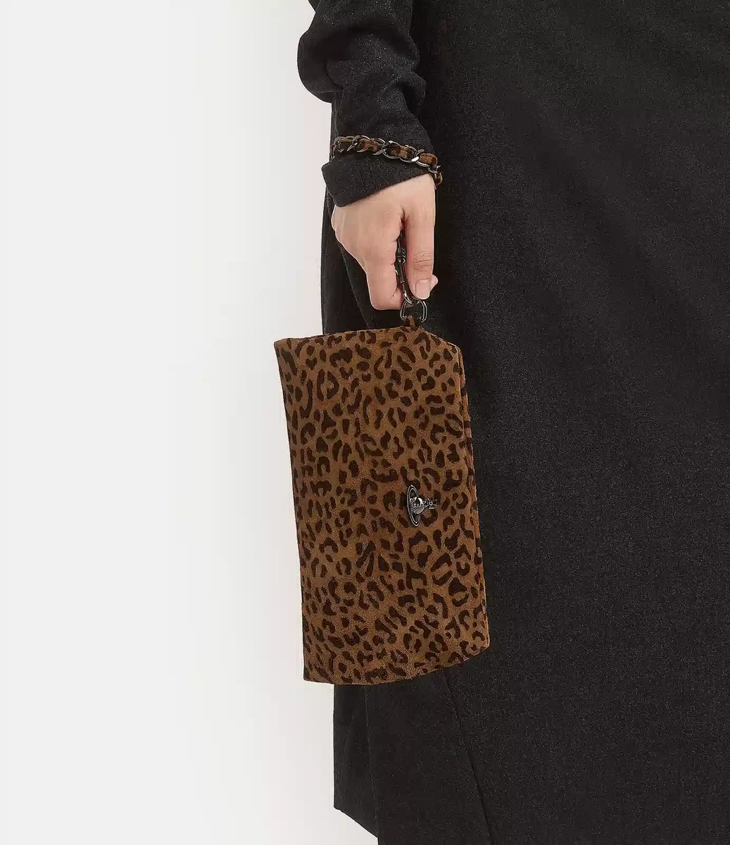 Saszetka na nadgarstek Vivienne Westwood Sadie jest wykonana z zamszu w panterkę i ma lekko wyściełany, prostokątny kształt.