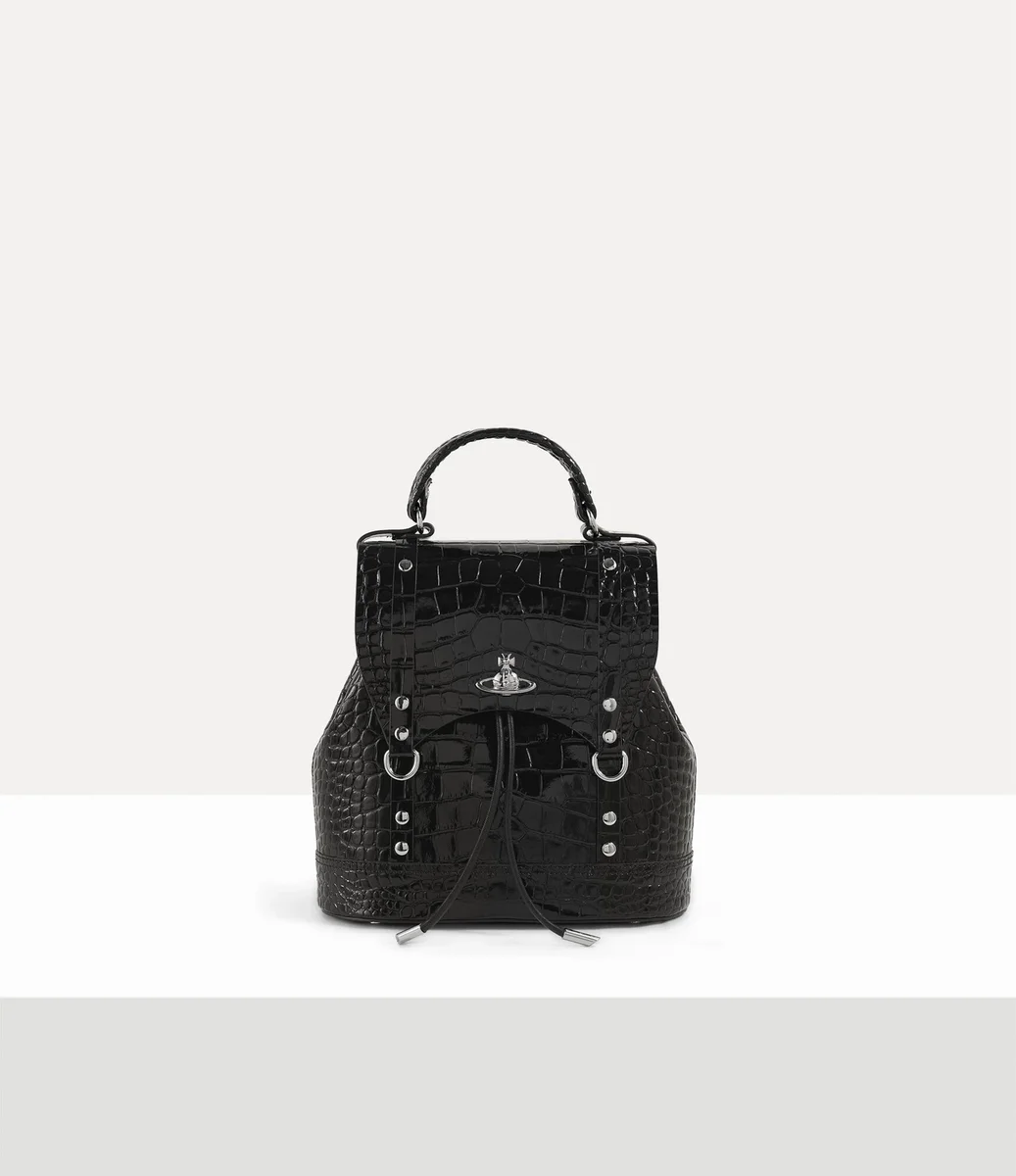 Nasz charakterystyczny mały plecak Max jest dostępny w wersji z tłoczoną skórą imitującą skórę krokodyla, z lakierowaną teksturą przypominającą płynny lateks i gumę sprzedawaną w naszym kultowym butiku Sex. Model ten zawiera elementy inspirowane stylem bondage, nawiązujące do naszej kolekcji „Erotic Zones” z sezonu wiosna-lato 1995.