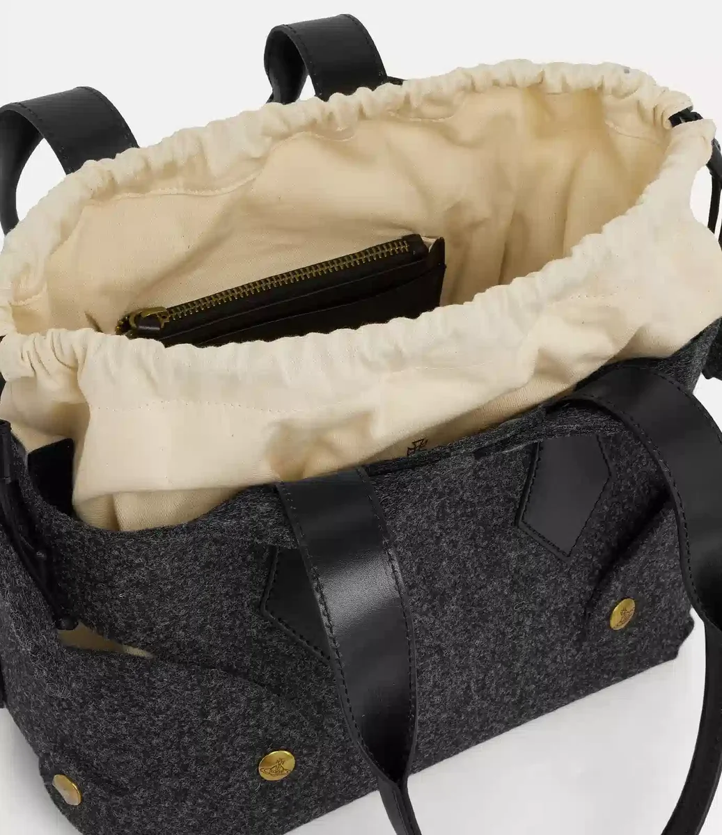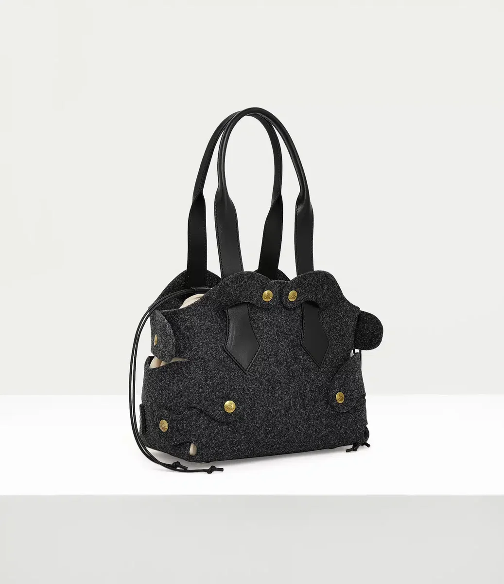 Torba Wilma Small jest wykonana z grubego filcu wełnianego przy użyciu techniki cięcia bezodpadowego, opracowanej po raz pierwszy dla kolekcji „Wake Up Cavegirl” na sezon jesień-zima 2007. Inspirowana naszymi archiwalnymi torbami Flintstone, torba posiada modułowy system zatrzasków i charakterystyczne uchwyty w kształcie grotu włóczni przechodzące przez zewnętrzną powłokę.