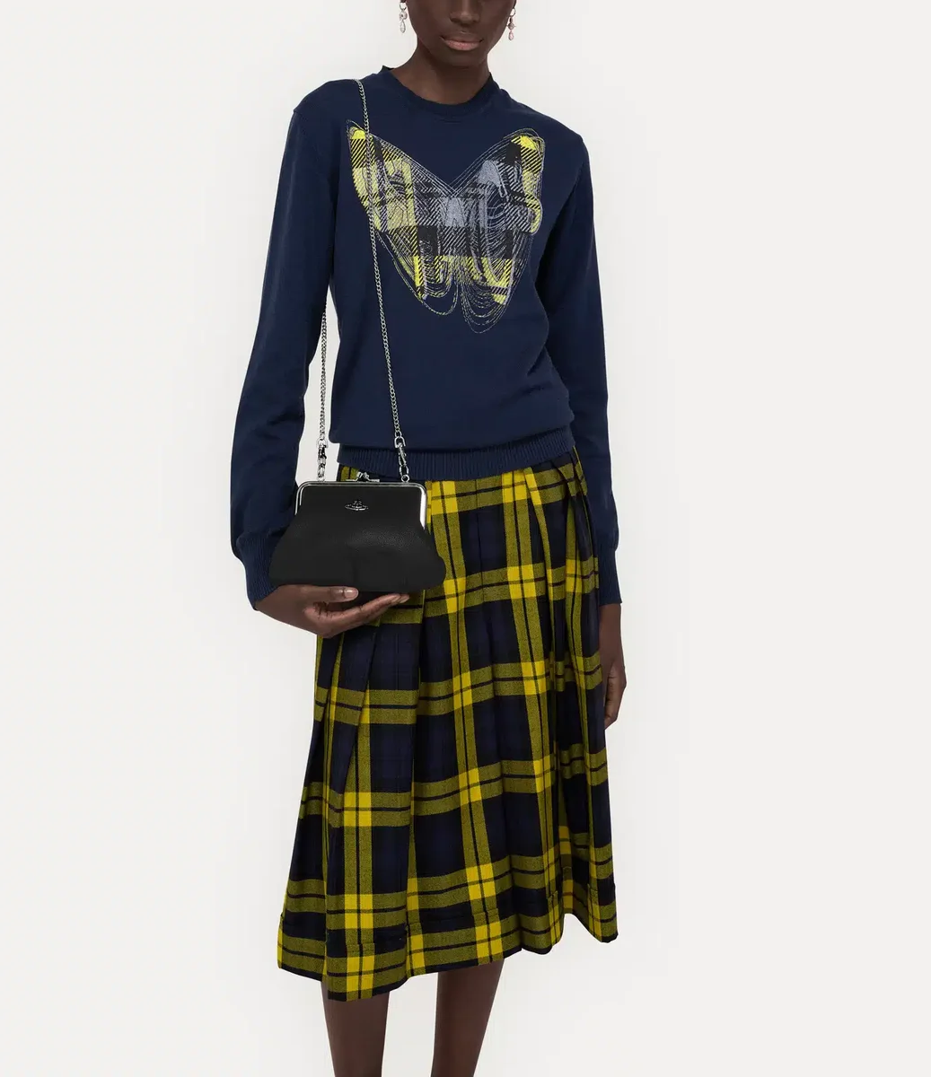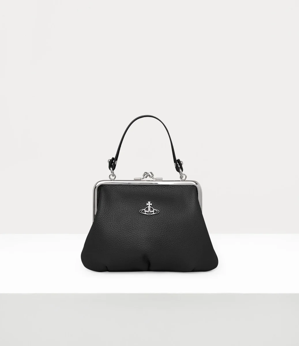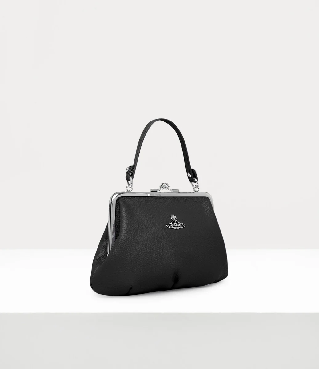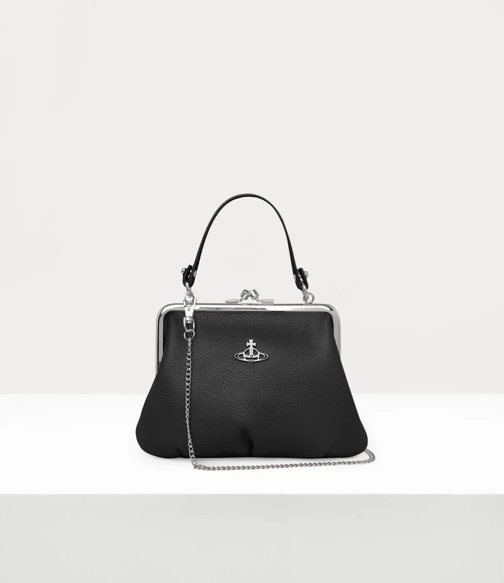 Nasza torebka Granny Frame ma sylwetkę inspirowaną stylem vintage i zamknięcie typu kiss-lock, przywodzące na myśl antyczne portmonetki z początku XX wieku. Wykończona jest miękką skórą PU i ozdobiona naszym klasycznym motywem „Line orb”, symbolizującym tradycję, otoczonym pierścieniami Saturna, symbolizującymi przyszłość.