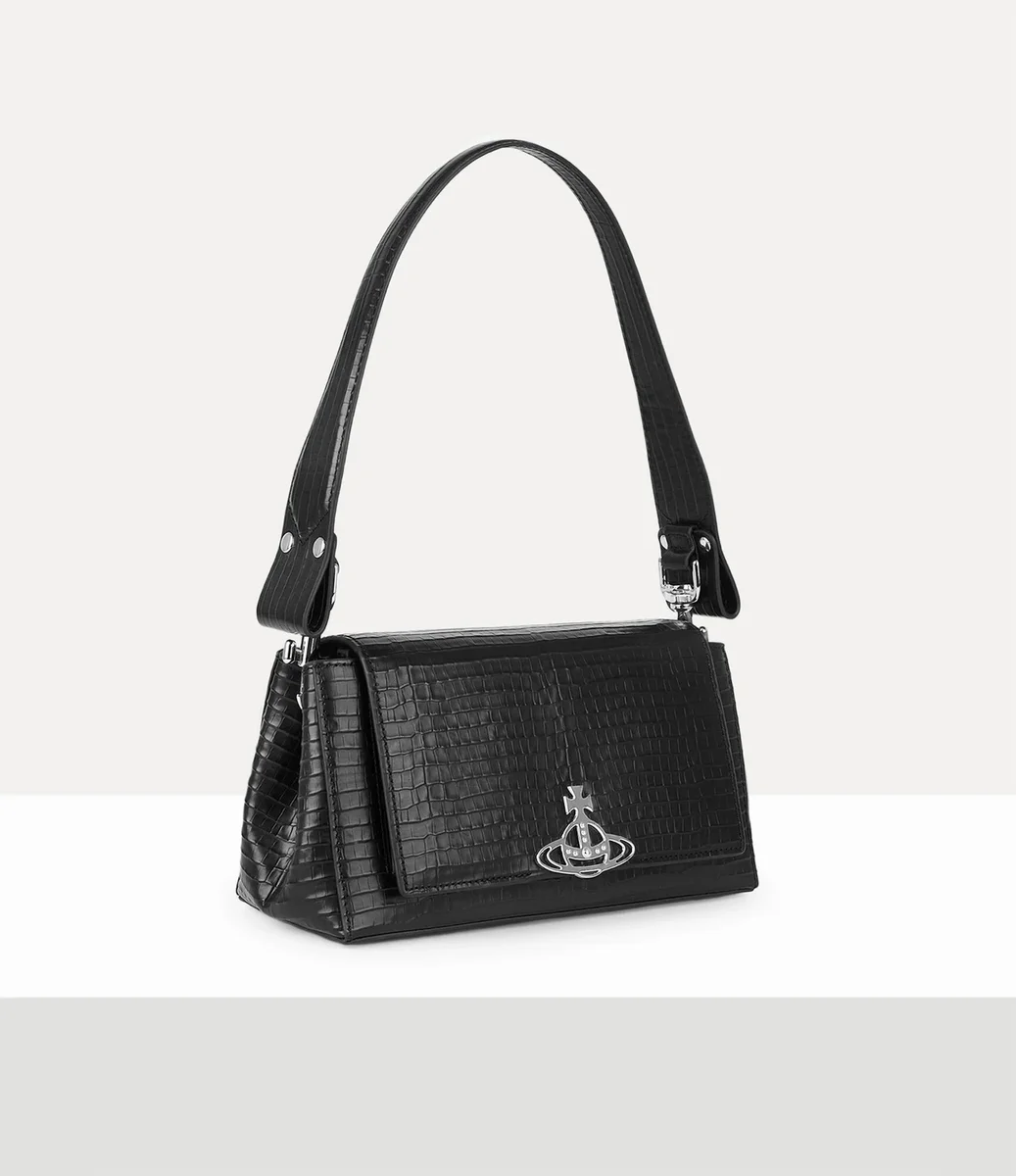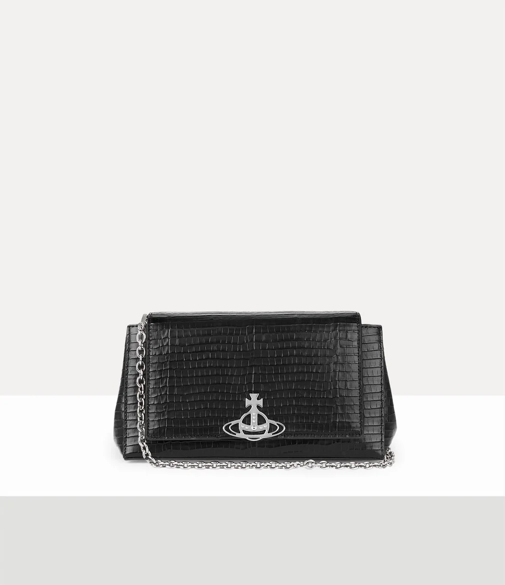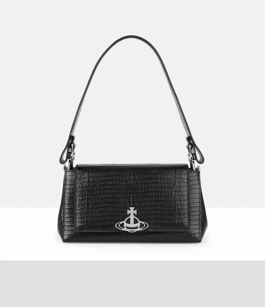 Nasza torebka Hazel Medium jest wykonana ze skóry i w tym sezonie wykończona wyrafinowanym tłoczeniem imitującym skórę krokodyla „Mini”. Wyściełana jest subtelną tkaniną moiré i posiada charakterystyczny dla naszej marki motyw „Line Orb” z przodu, symbolizujący tradycję, otoczony niebiańskimi pierścieniami Saturna, symbolizującymi przyszłość.