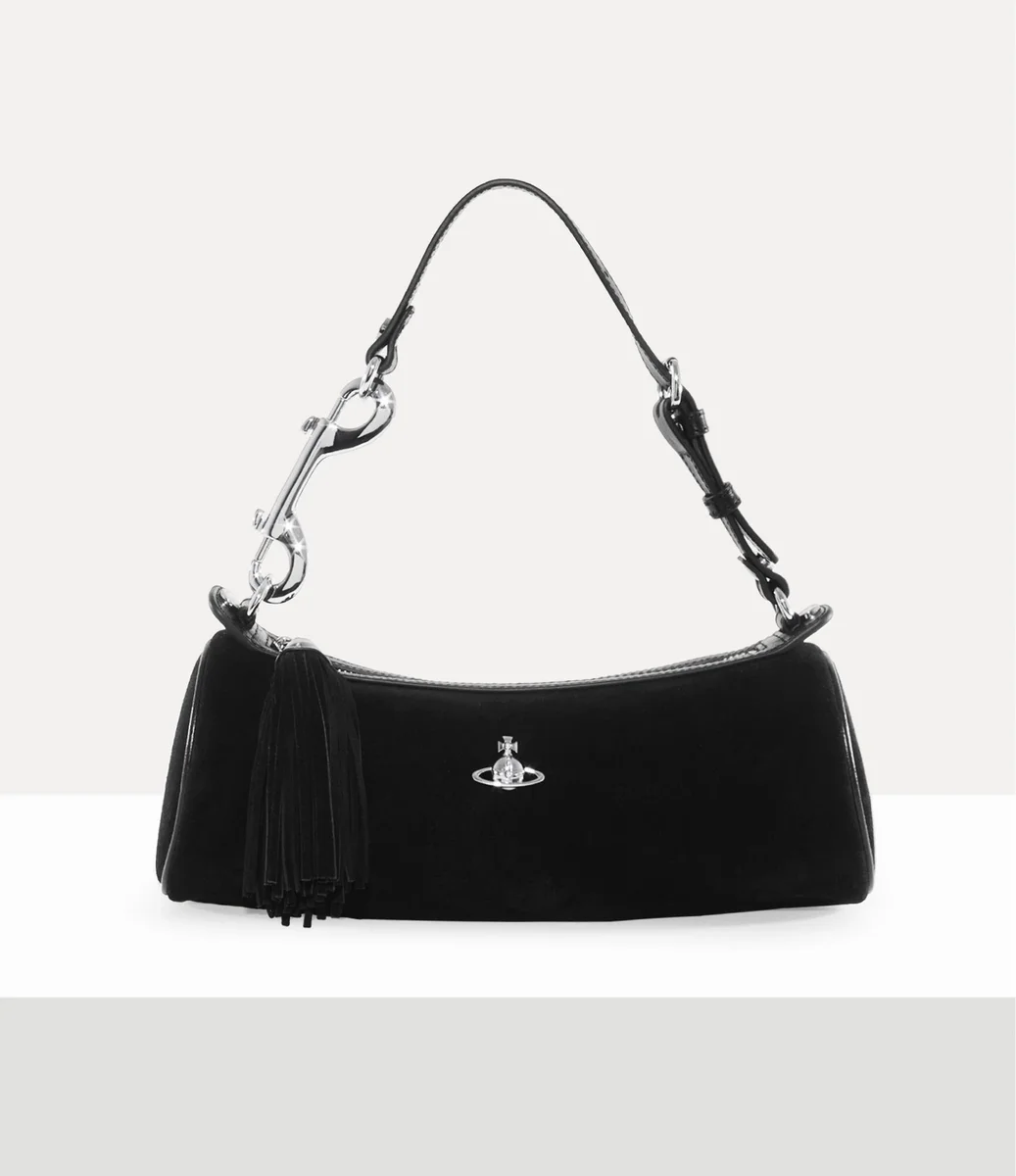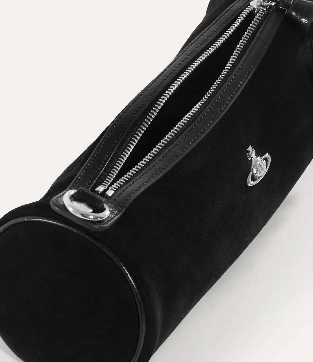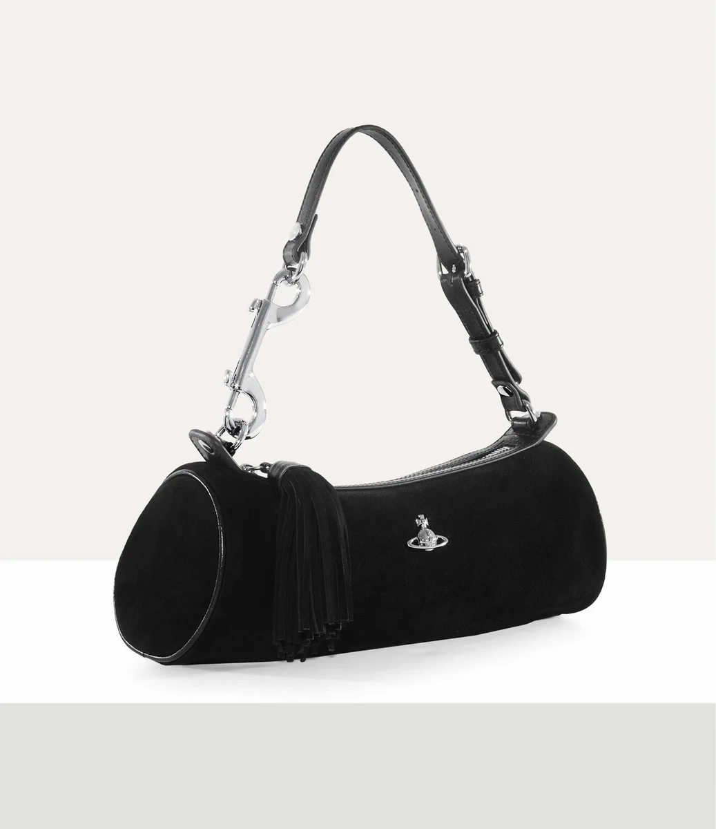 Nasza torebka Cindy Cylinder jest w tym sezonie dostępna w wersji z miękkiego zamszu, z charakterystycznym dla marki płaskorzeźbionym symbolem na przedniej części. Model ma eleganckie metalowe detale, takie jak karabińczyk i pierścień w kształcie litery D, które nadają mu styl DIY.