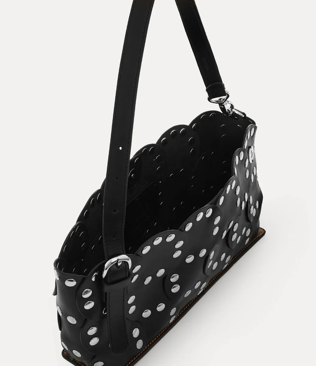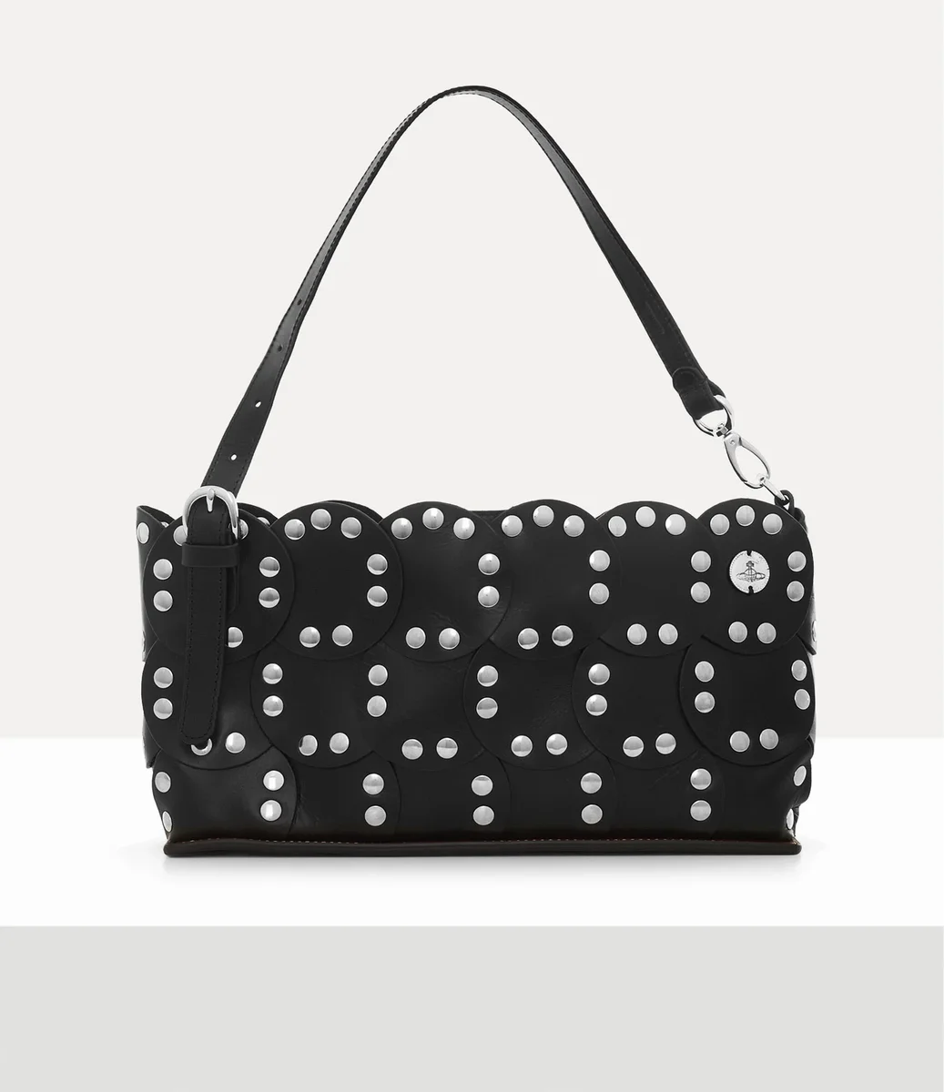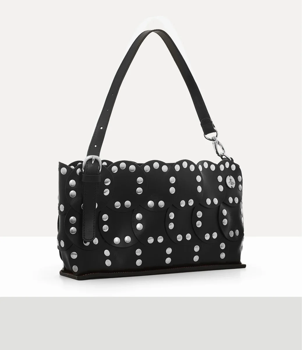 Torebka Vivienne Westwood Liz Concho jest wykonana z ręcznie wycinanych skórzanych kółek połączonych ze sobą i ozdobiona wiszącą zawieszką w kształcie monety.