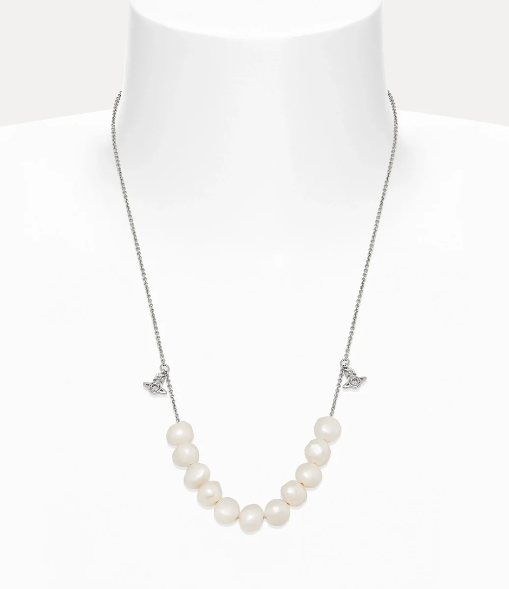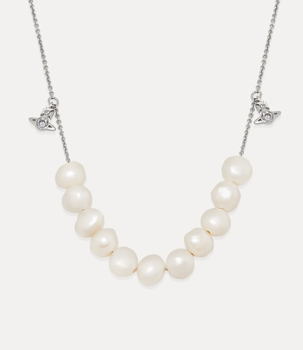 Perły pozostają istotnym elementem ikonografii domu mody, przywołując poczucie minionego luksusu. Naszyjnik Man. Azul ma rząd barokowych pereł słodkowodnych na łańcuszku typu trace, zakończony dwoma wiszącymi motywami w kształcie kuli po obu stronach wzoru.