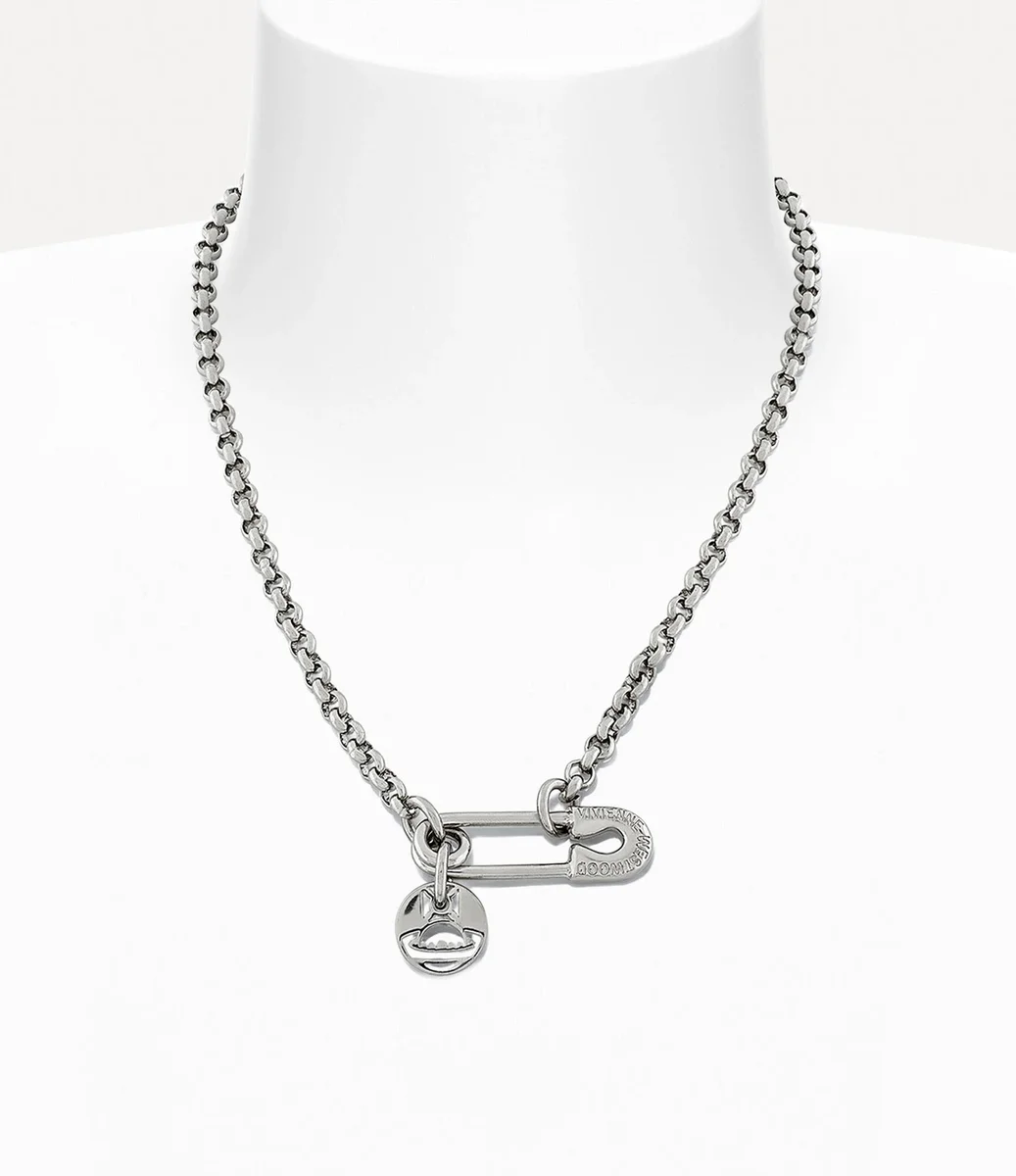 Srebrny naszyjnik Man. Imogene posiada wyciętą zawieszkę w kształcie kuli, która zwisa z końca grawerowanego zapięcia w kształcie agrafki. Jest wyposażony w łańcuszek typu belcher i zapięcie typu karabińczyk.
