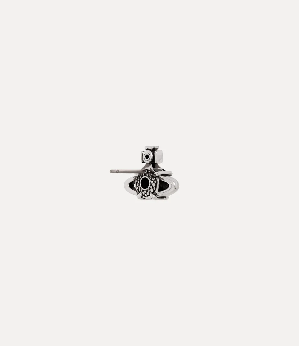 Nasza charakterystyczna kolczyka Man. Reina Single jest wykonana z metalu w kolorze srebrnym z oksydowanym wykończeniem, które nadaje jej antyczny wygląd. Projekt jest ozdobiony okrągłym czarnym kamieniem szlachetnym umieszczonym pośrodku kuli i krzyża, odzwierciedlającym wizję Vivienne dotyczącą przeniesienia tradycji w przyszłość.
