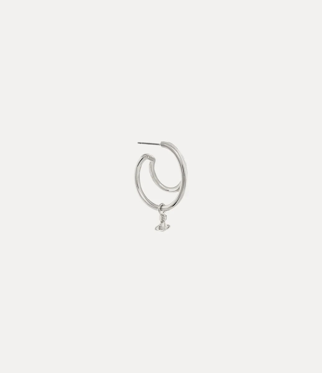 Kolczyk Man. Ronda Single charakteryzuje się modnym w tym sezonie podwójnym obręczowym kształtem, który tworzy iluzję wielu przekłuć. Model ma wypolerowane, srebrne wykończenie, podkreślone wiszącym motywem kuli, który elegancko umieszczony jest pomiędzy obręczami lub może być zdjęty, aby uzyskać bardziej minimalistyczny wygląd.