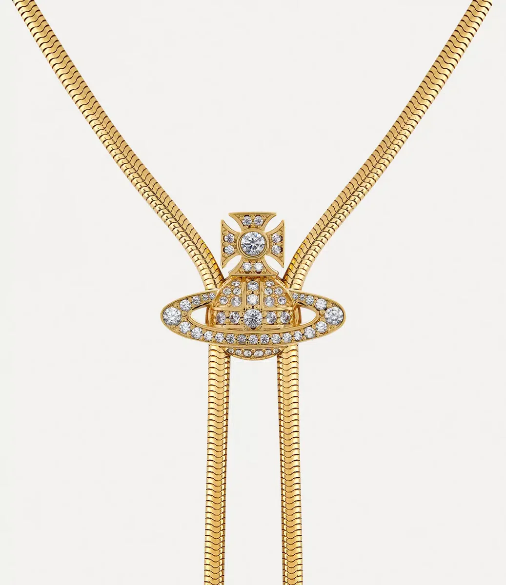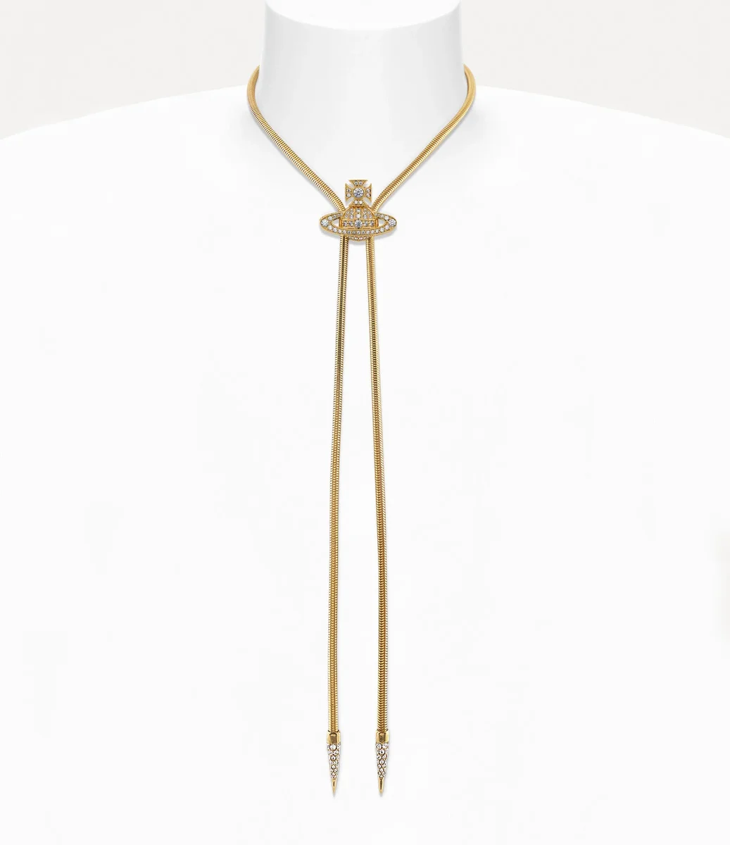 Nasza złota krawatka Bolo jest inspirowana charakterystycznym motywem kuli marki i ozdobiona kryształami w technice pavé. Wykonana z eleganckiego łańcuszka typu snake i zakończona spiczastymi kryształowymi końcówkami, może być regulowana do różnych długości poprzez przesuwanie centralnej części kuli, co pozwala na indywidualne dopasowanie.