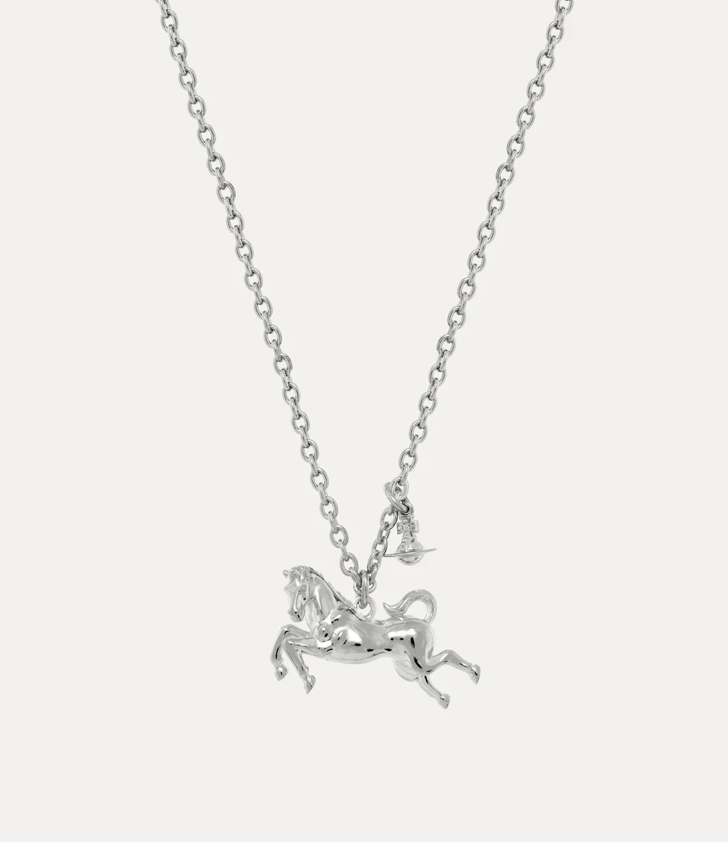 Vivienne Westwood Man. Naszyjnik z zawieszką Cheval wykonany z srebra pochodzącego z recyklingu, ozdobiony motywem konia, zawieszony na delikatnym łańcuszku pokrytym platyną.