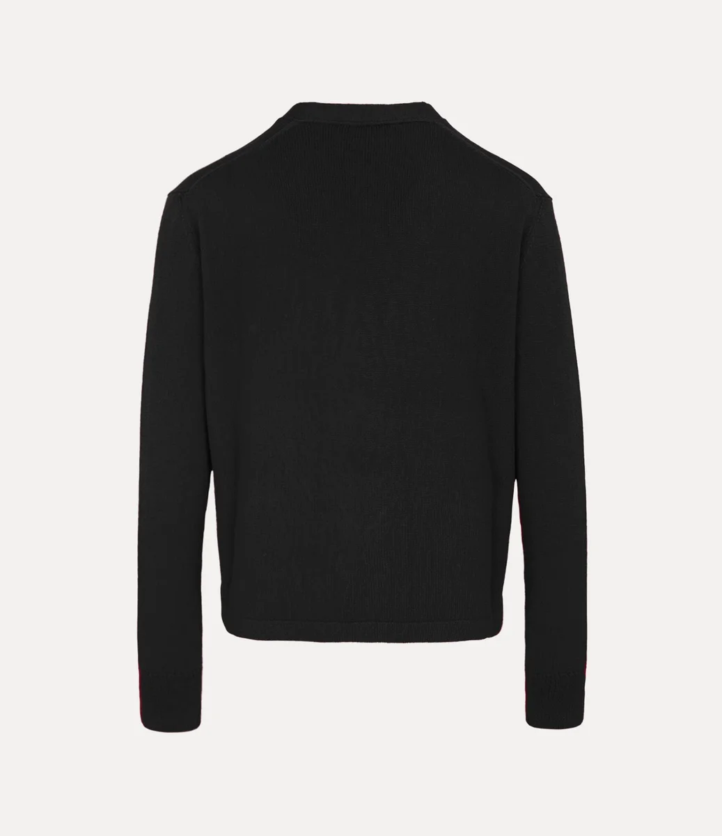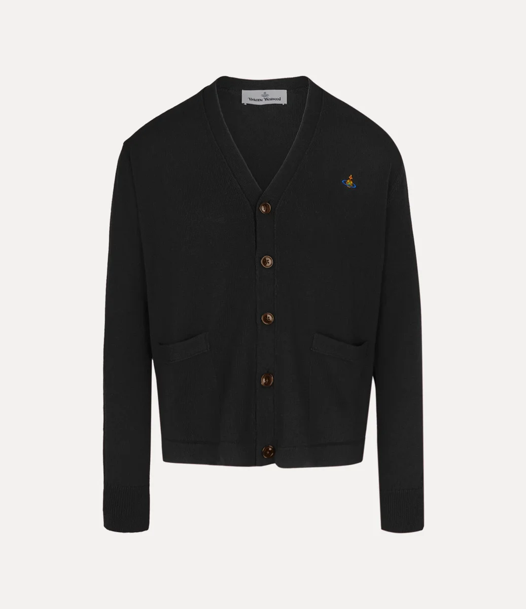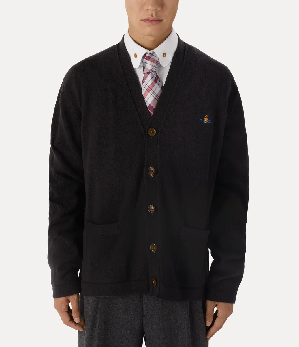 Nasza archiwalna kardigana Alex została w tym sezonie odświeżona i jest teraz dostępna w miękkiej mieszance bawełny i kaszmiru. Model ma zapięcie na guziki z przodu, dekolt w szpic i detal w kształcie kuli po lewej stronie klatki piersiowej, który symbolizuje wizję Vivienne dotyczącą przeniesienia tradycji w przyszłość.
