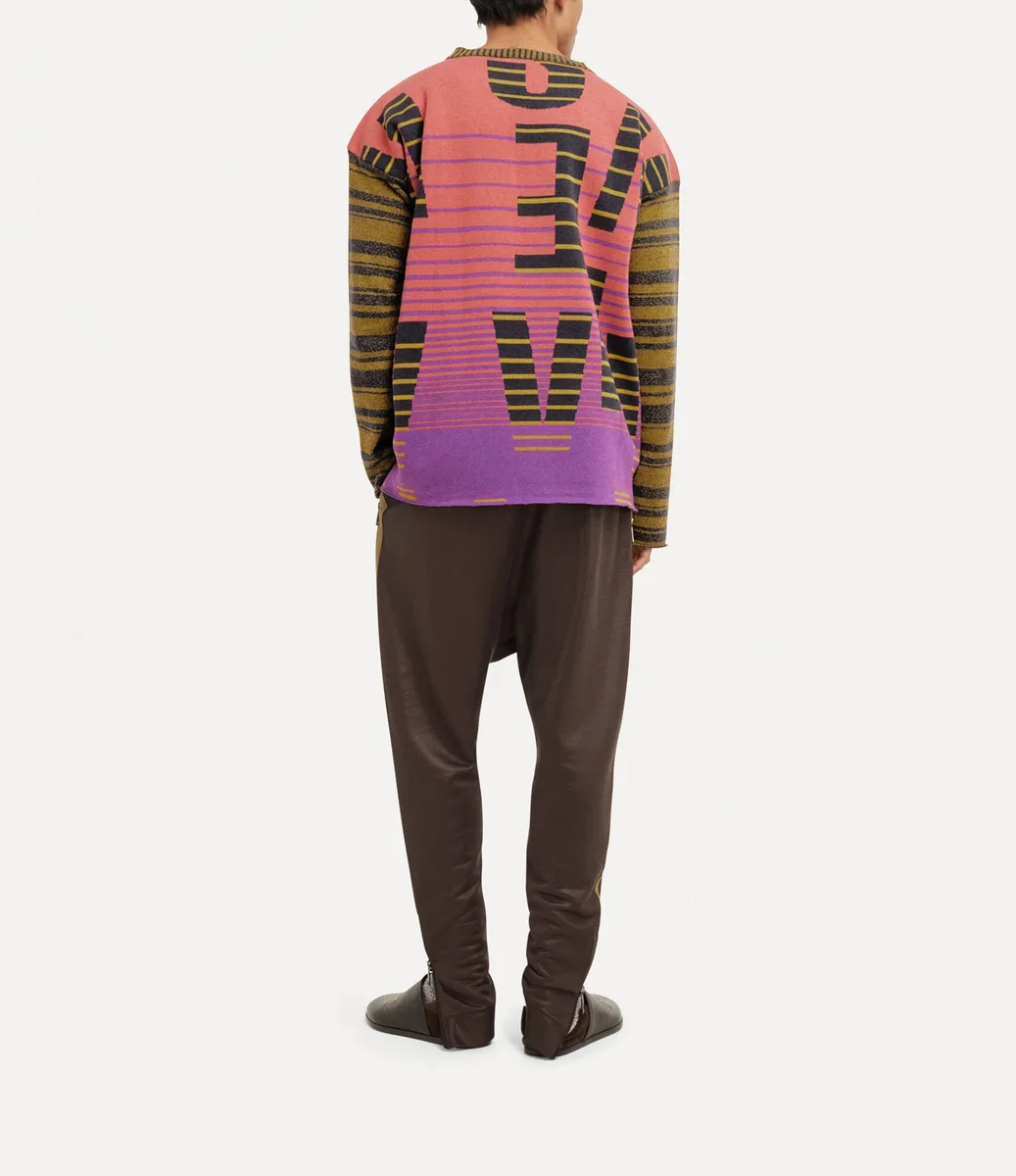 Sweter Bruno jest wykonany z mieszanki bawełny i wełny, ma okrągły dekolt i luźny krój. Charakteryzuje się paskami „Logomania” w stylu żakardowym z efektem gradientu, wykończonymi rolowanym brzegiem i charakterystycznym dla marki ściegiem „TV” na rękawach, przywodzącym na myśl zakłócony sygnał telewizyjny.