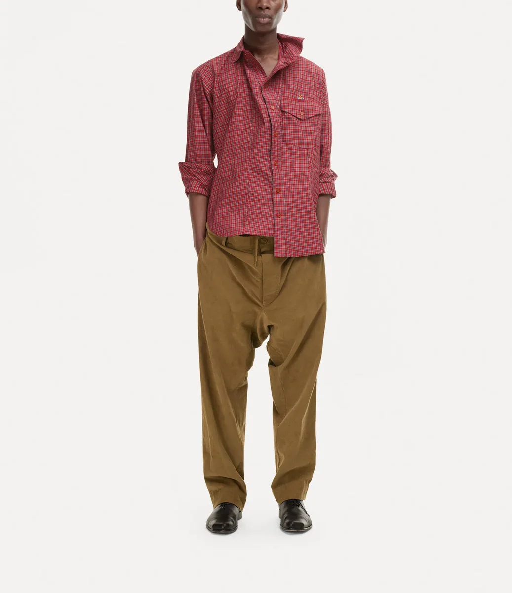 Koszula Chaos nawiązuje do eksperymentalnego systemu krawieckiego „Drunken” Vivienne, charakteryzującego się asymetrycznym dołem i przesuniętym na bok zapięciem na guziki. Wykonana z tkaniny w żywe szkockie kratki, ozdobiona jest wielobarwnym haftem w kształcie kuli.