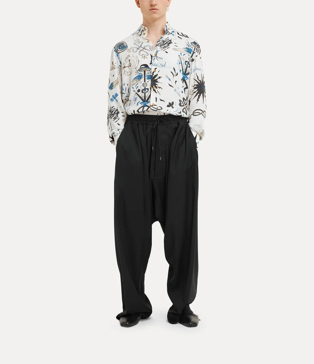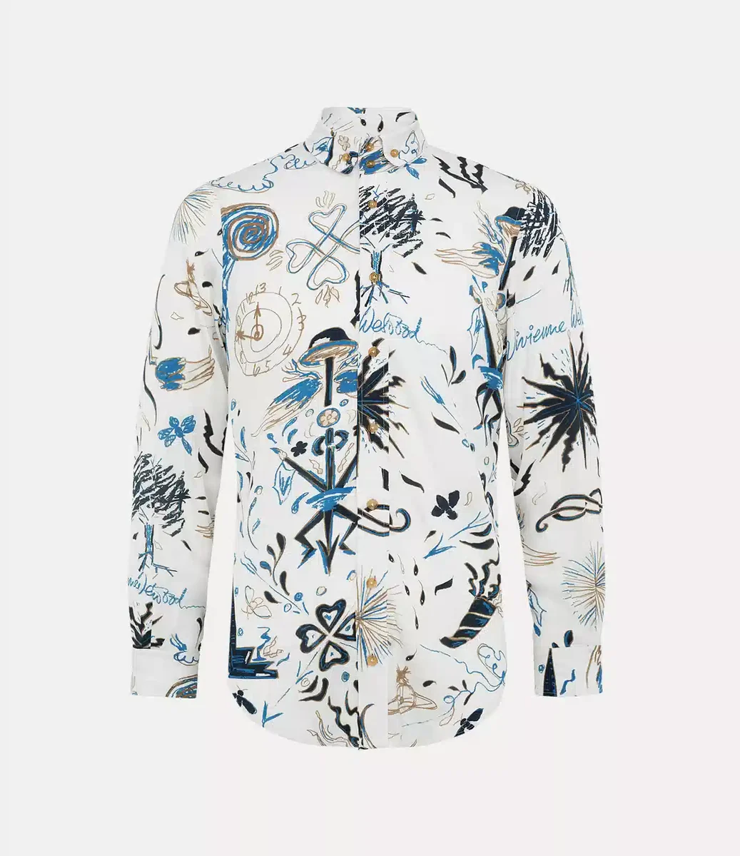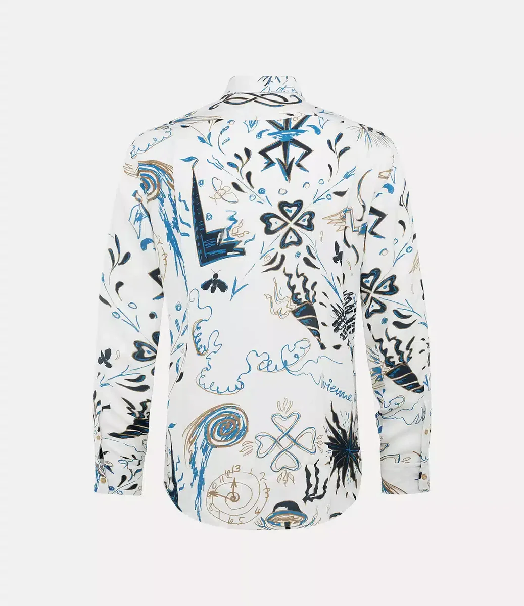 Sylwetka koszuli Two Button Krall czerpie inspirację z archiwalnego projektu, charakteryzującego się charakterystycznym dla Vivienne kołnierzem z dwoma guzikami. Inspirowana obrazem „Śmiejący się kawaler” autorstwa Fransa Halsa, koszula jest pokryta abstrakcyjnym wzorem graficznym zawierającym charakterystyczną dla marki ikonografię.