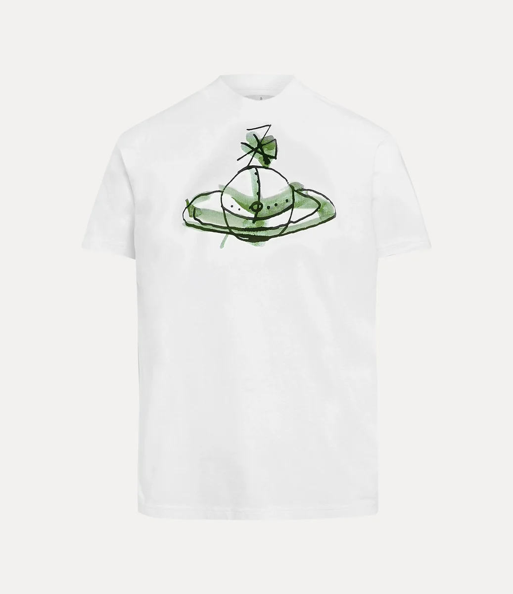 Nasza klasyczna koszulka ma miękki bawełniany krój, krótkie rękawy i okrągły dekolt, wykończony prążkowanymi ściągaczami. Model zdobi nadruk „Drawn Orb” z bieżącego sezonu, zaprojektowany tak, aby imitować ręcznie malowane pociągnięcia pędzlem – nawiązanie do charakterystycznej dla marki estetyki DIY.