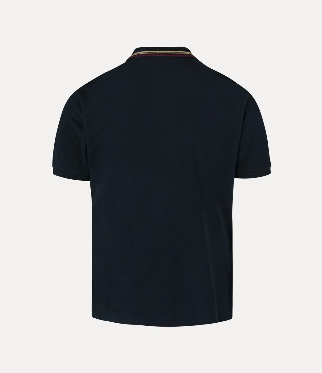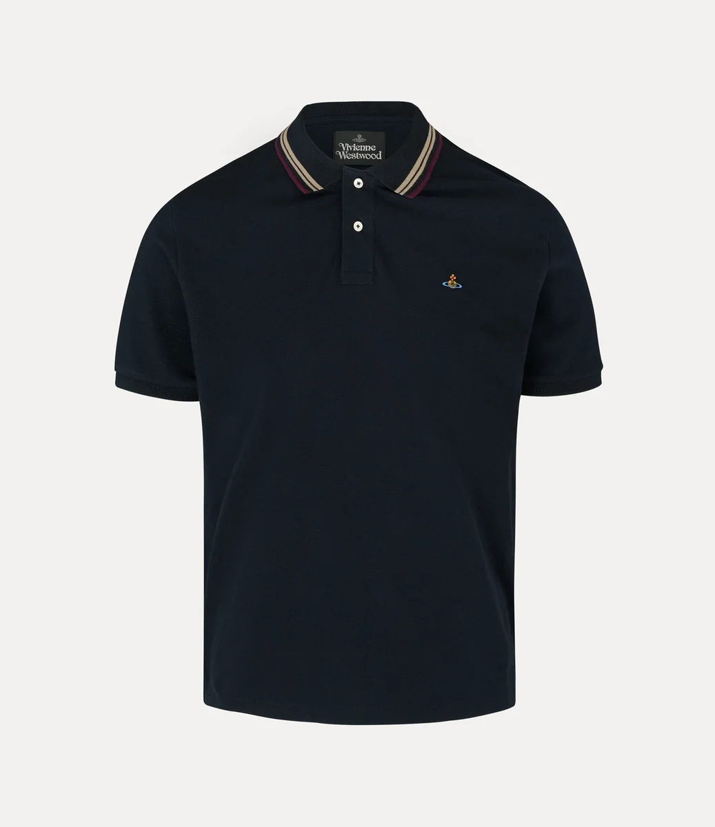 W tym sezonie nasza klasyczna koszulka polo została odświeżona dzięki błyszczącym guzikom z masy perłowej i paskom na kołnierzu. Wykonana z miękkiej bawełny, posiada haftowany motyw kuli po lewej stronie klatki piersiowej, symbolizujący tradycję, otoczony niebiańskimi pierścieniami Saturna, reprezentującymi przyszłość.