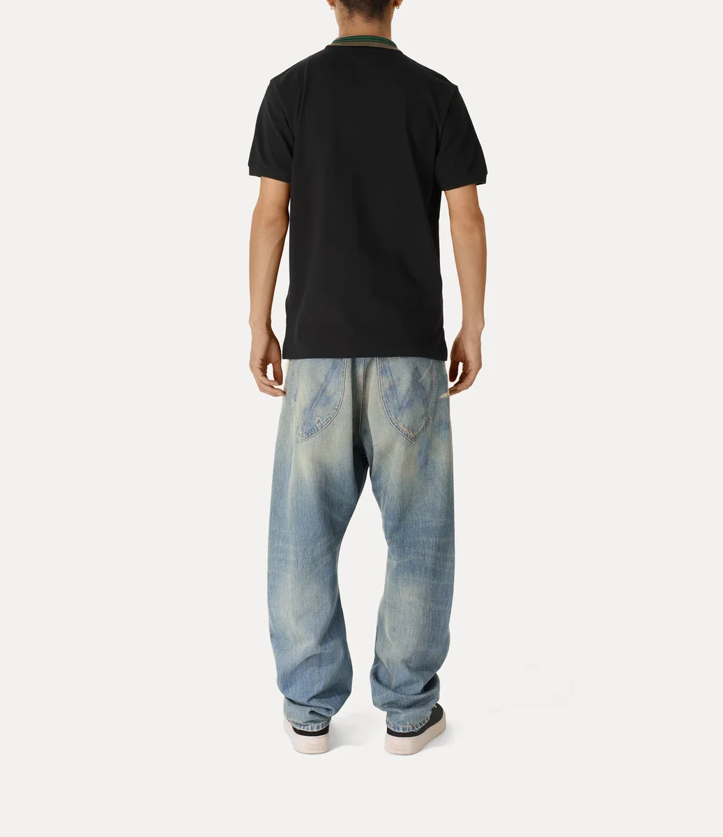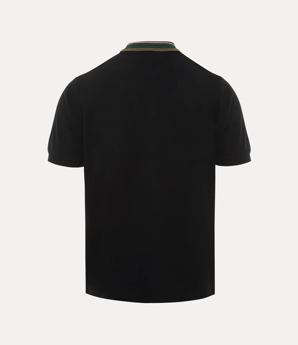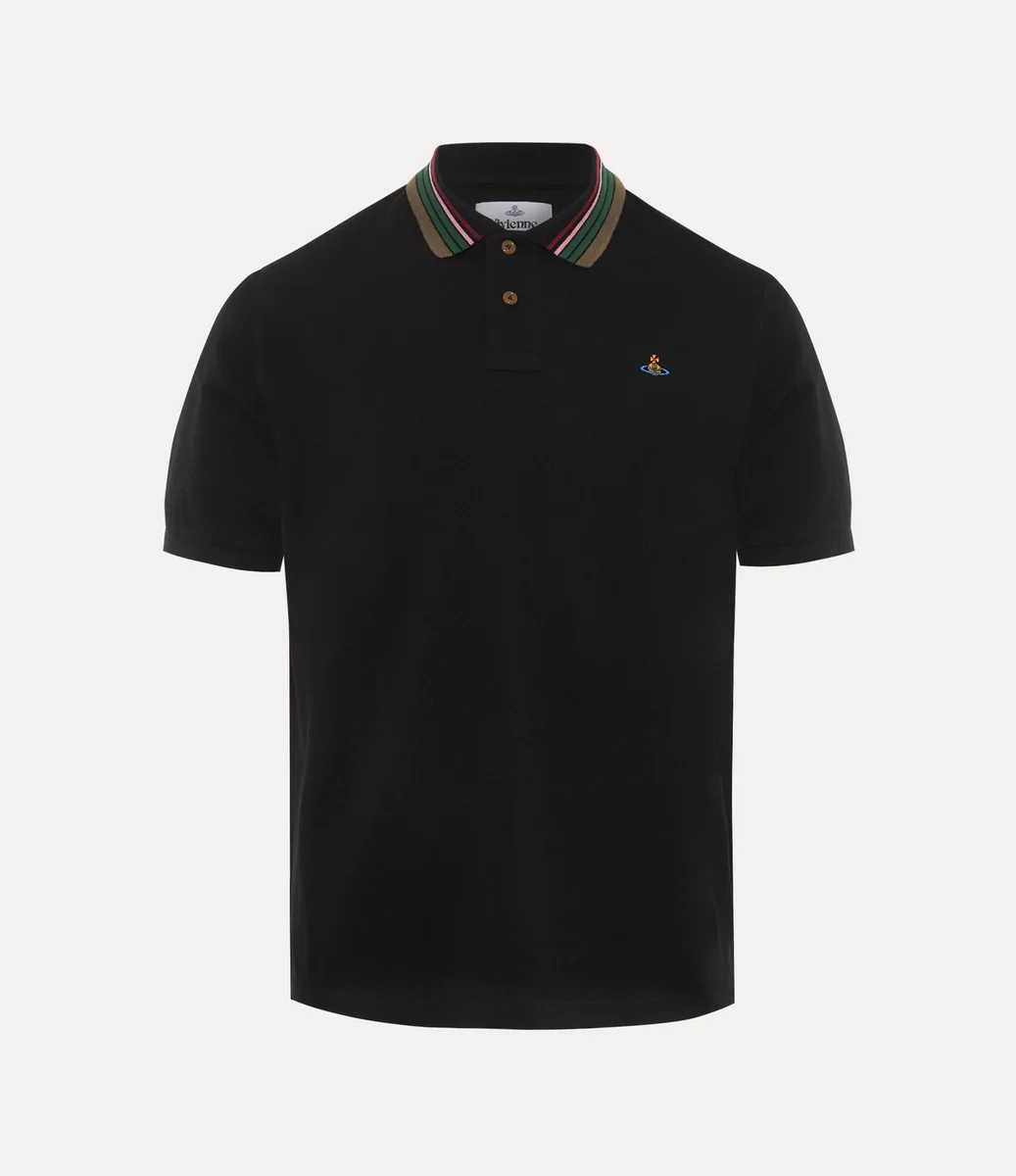 Nasza klasyczna koszulka polo ma kontrastowy kołnierzyk z wielobarwnymi paskami. Wykonana z miękkiej bawełny, ma haftowany motyw kuli po lewej stronie klatki piersiowej, symbolizujący tradycję, otoczony niebiańskimi pierścieniami Saturna, symbolizującymi przyszłość.