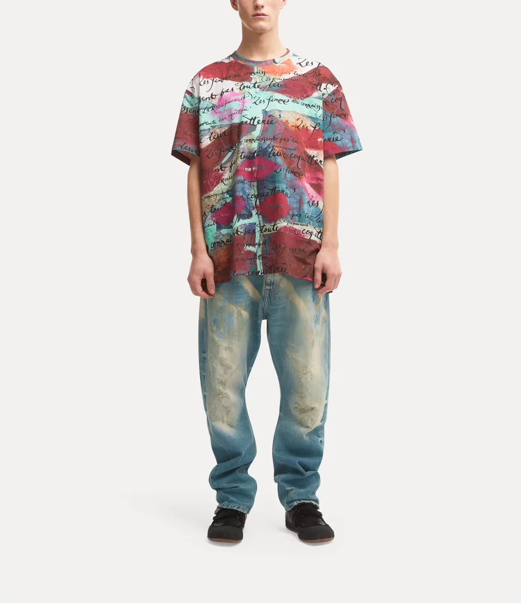 Nasza charakterystyczna oversize’owa koszulka została w tym sezonie przeprojektowana i ozdobiona nadrukiem „Les Femmes Ne Connaissent Pas Toute Leur Coquetterie”, nawiązującym do zamiłowania Vivienne do literatury. Model zdobi grafika „Lipstick Kisses”, inspirowana opakowaniem perfum „Boudoir” marki.