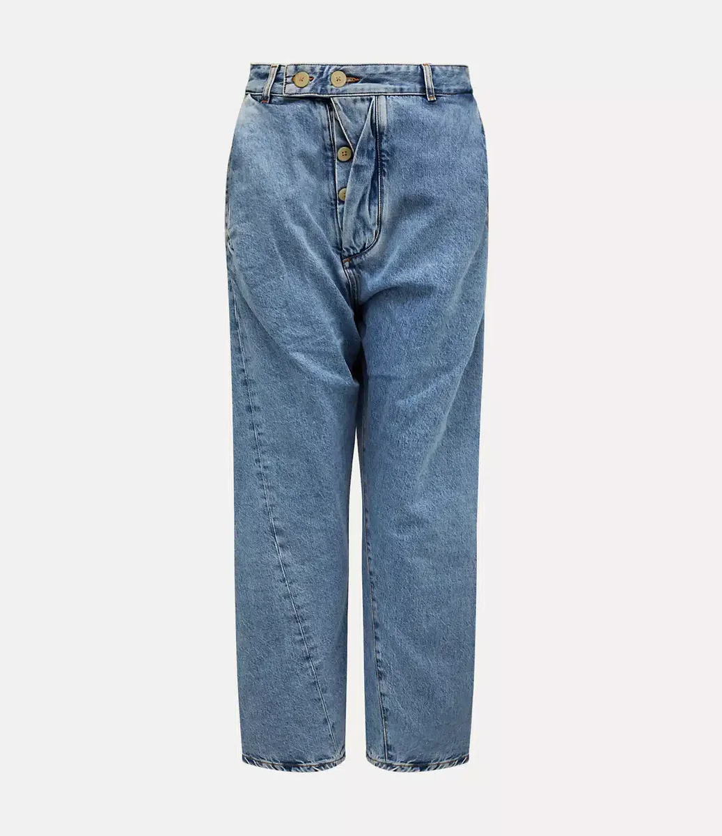 Spodnie Worlds End Drunken, w jasnym kolorze denimowym, charakteryzują się charakterystycznym dla marki systemem drunken, który czerpie z tradycyjnego brytyjskiego krawiectwa, ale ma nieco przekręcone i asymetryczne podejście do kroju. Spodnie wyróżniają się asymetrycznym zapięciem z przodu, które tworzy zniekształcony, drapowany efekt, uosabiający punkową estetykę marki.p>